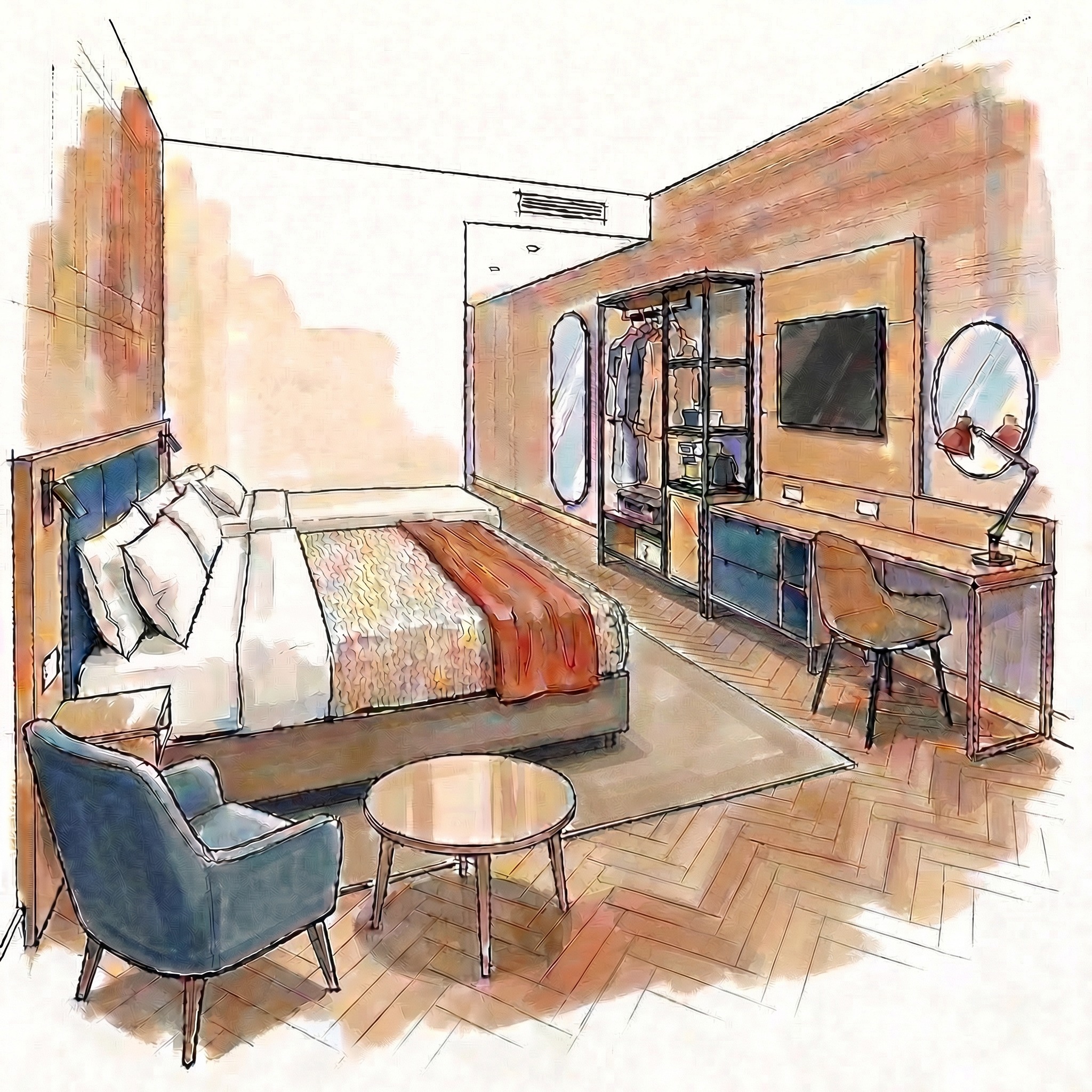Please note the image shown is an artist’s impression of our King Rooms with Pull-out Beds in Dunham Lodge. These brand new rooms are currently being built in a newly developed lodge to the rear of the pub and are due to open in May 2026. The final design, layout and finishes may vary slightly once completed.
